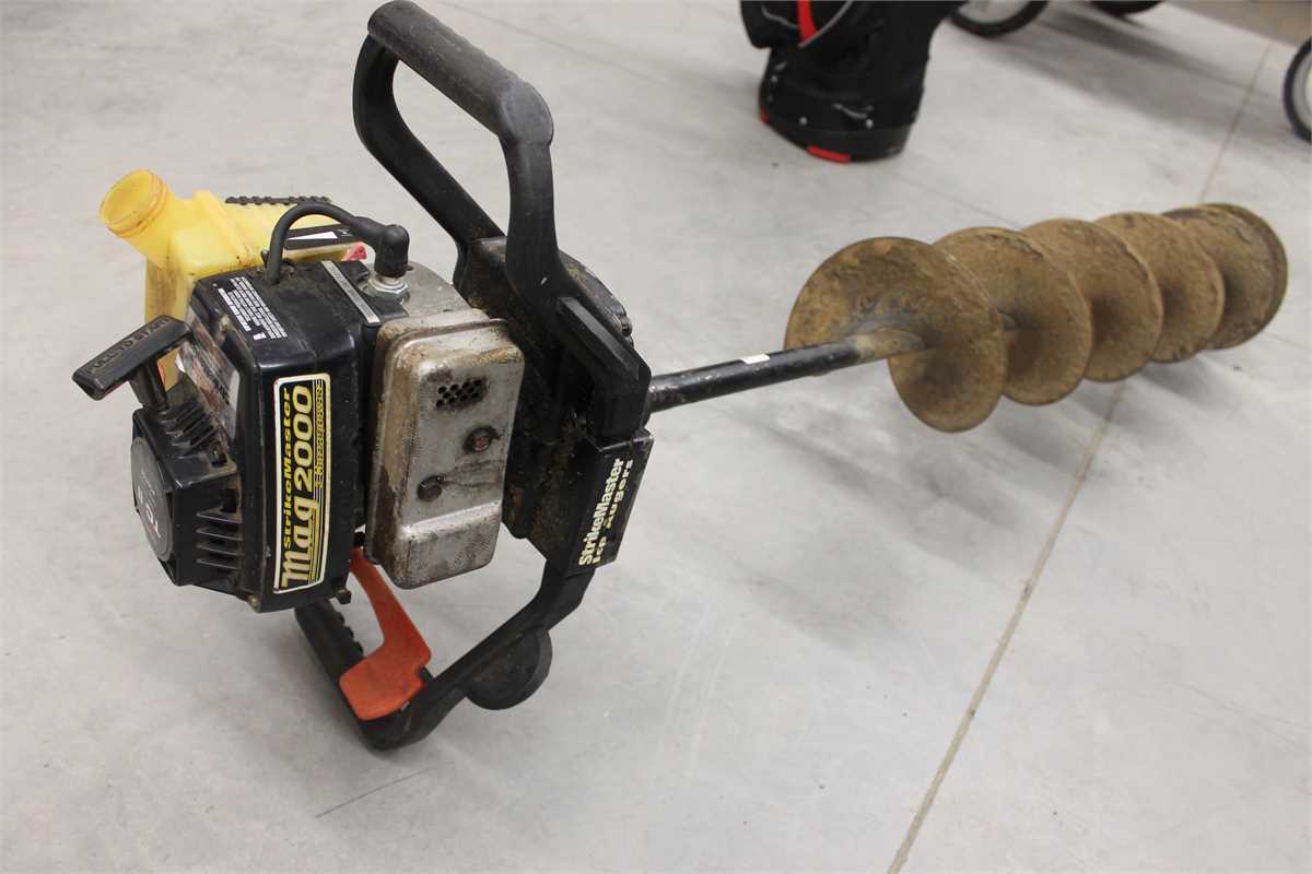 Strike Master Mag 2000 ice auger. unknown year., no gas cap, rusty auger.