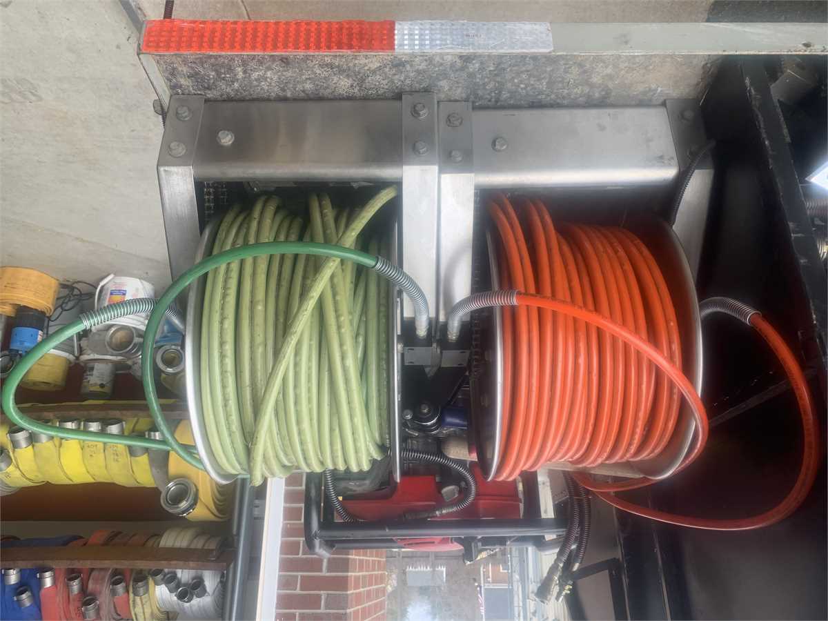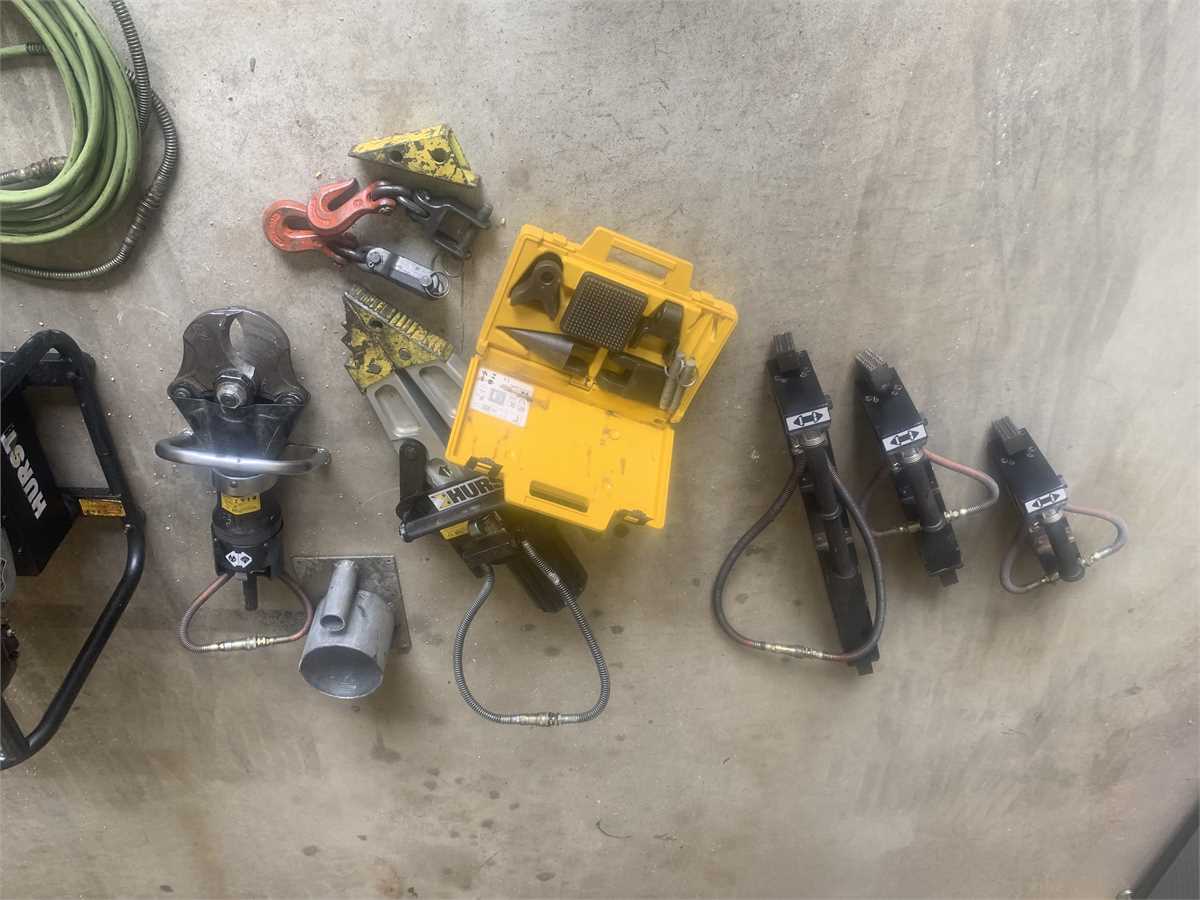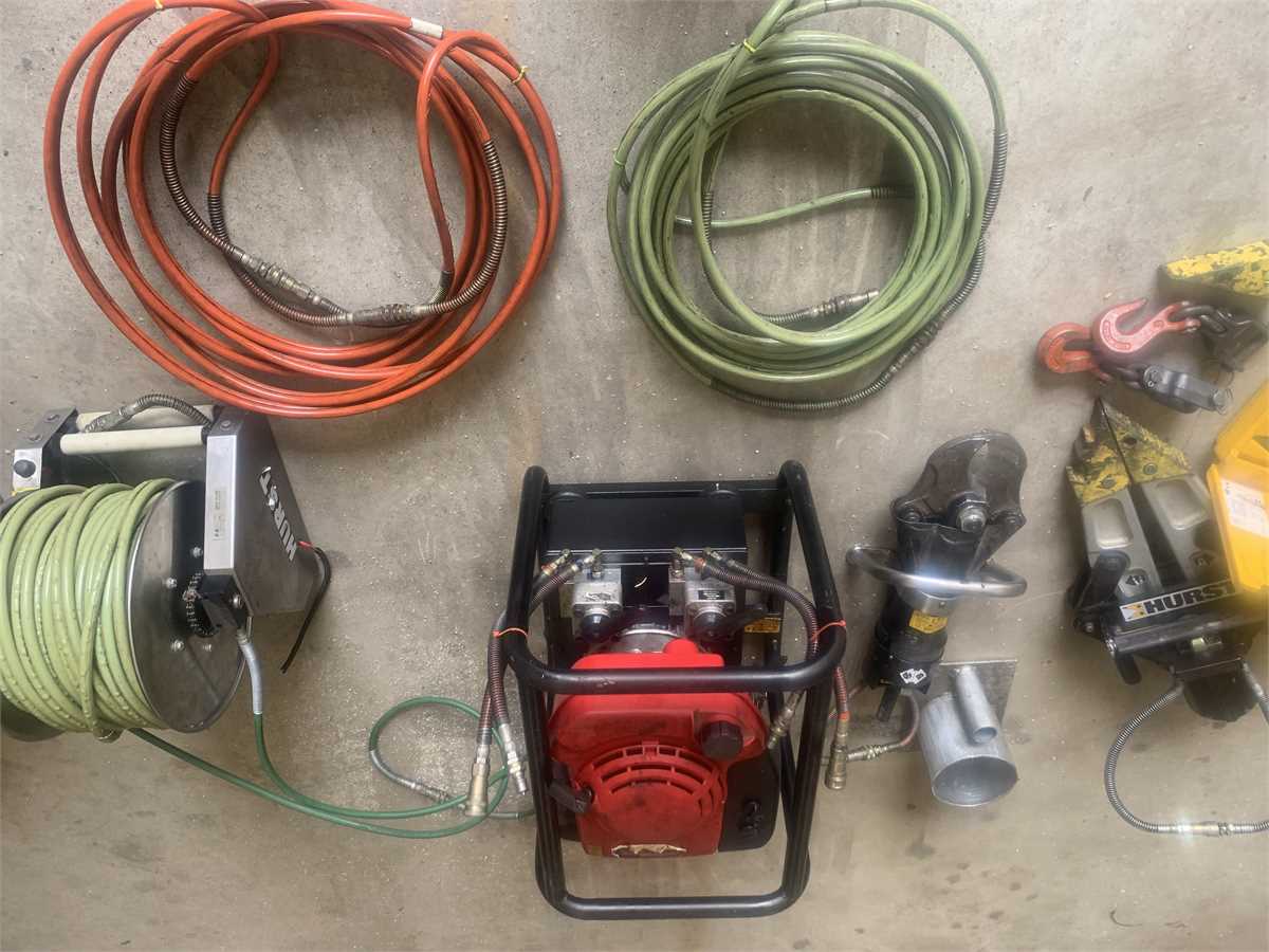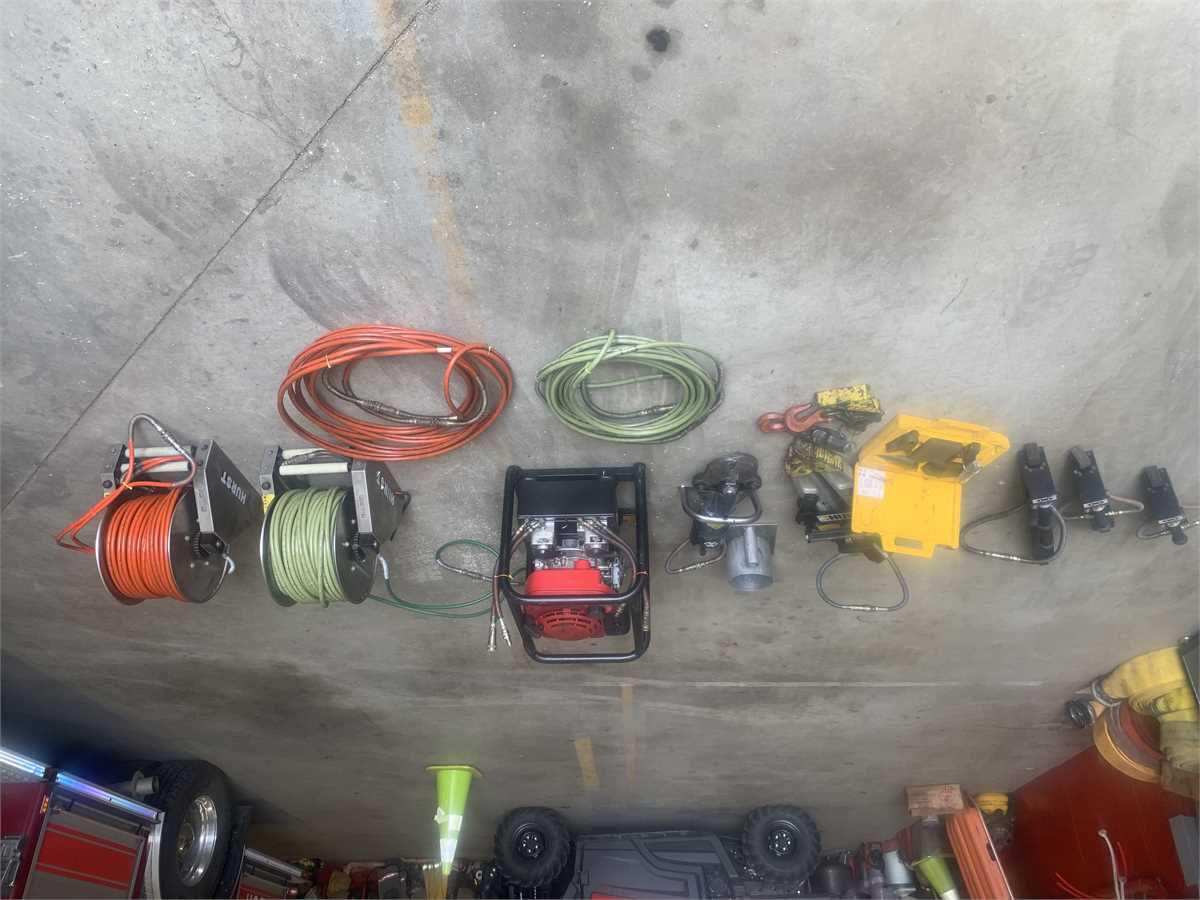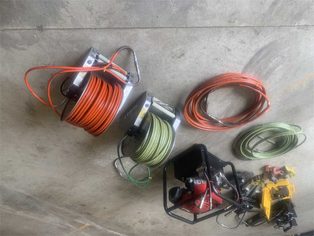 Full set of Hurst hydraulic extrication equipment. 3-Rams, cutter, spreader, Honda power unit that will run simultaneous tools. 2-Hannay electric hose reels with 200’ hydraulic hose per. 2-50’ spare/add-on hoses. Chain hook adapters for spreader and assorted tips.