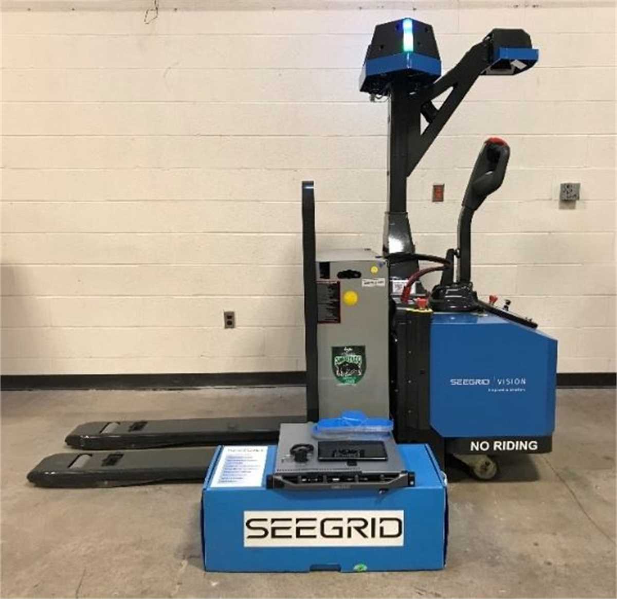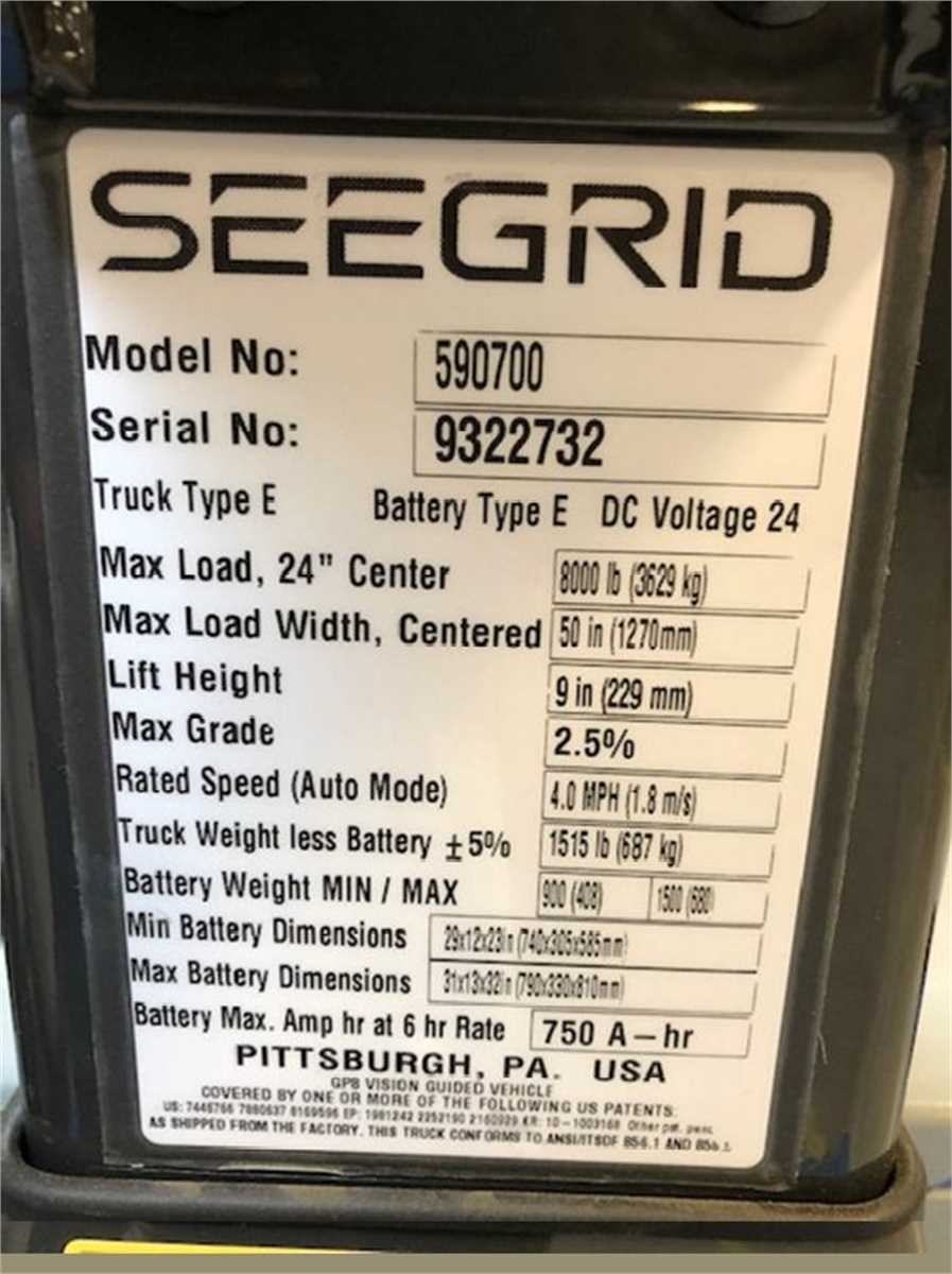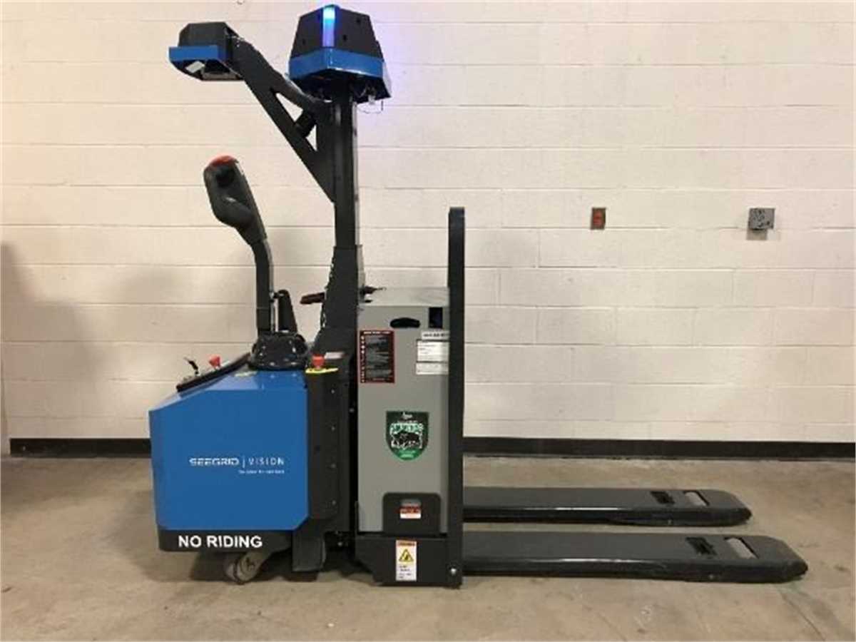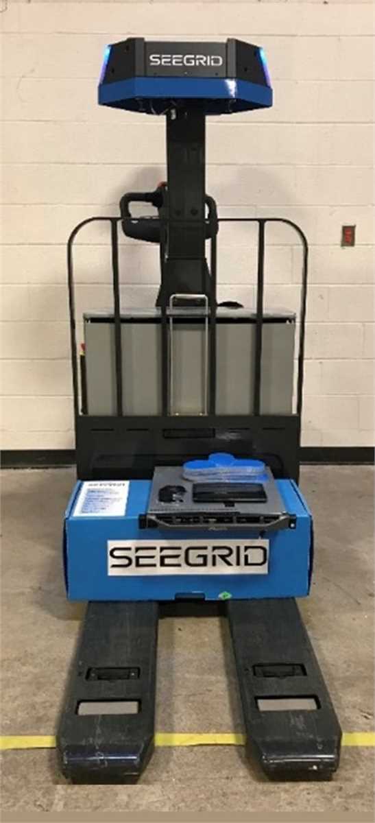 Pallet Jack: Model #: 590700 S/N #: 9322732 Vehicle Hours: 828 (used for R&D, market research) Includes: Vehicle Battery, 2) Safety Rated Laser Scanners, Control System PC (Dell EMC Server) ** This is a Vision Guided Assembly vehicle **