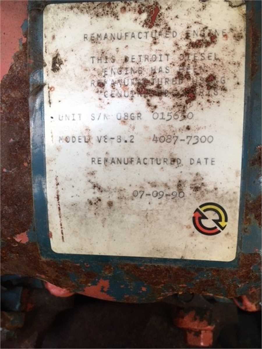 Detriot 8.2L diesel engine. photos of engine bay and engine Reman tag added 2/11/21 9:15AM EST