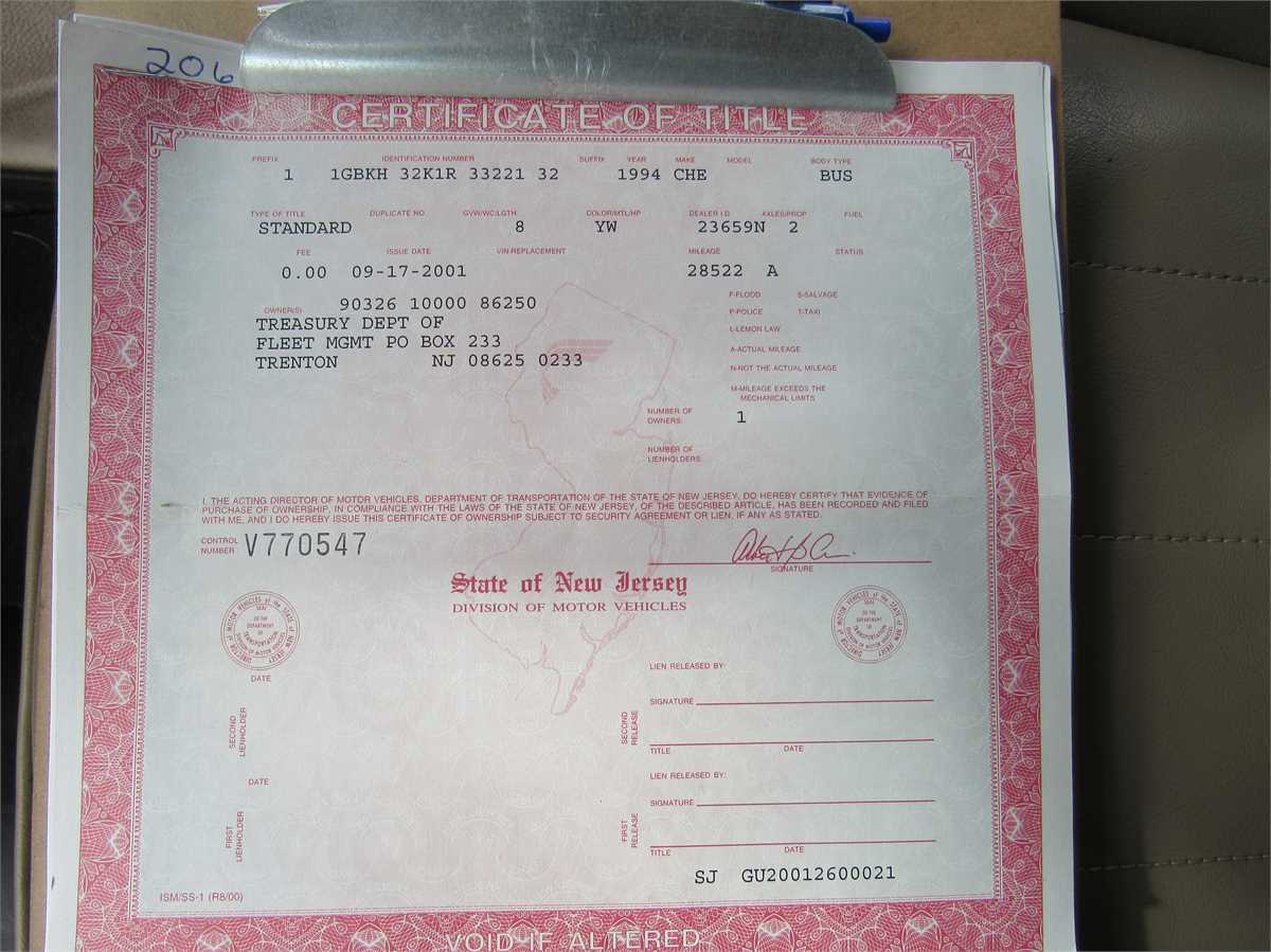 1994 Chevy G30 bus with a 5.7L, V8 gas engine and an automatic transmission. This vehicle is missing the catalytic converter. The driver side door handle is missing, the inside cabin floor is rotting in some areas and the guard rail on driver side is broken. The GVWR on this bus is 14,500 and it has minor dents, scratches and dings. This vehicle was previously used by the state of New Jersey. Winning bidder will receive a clean title and keys.