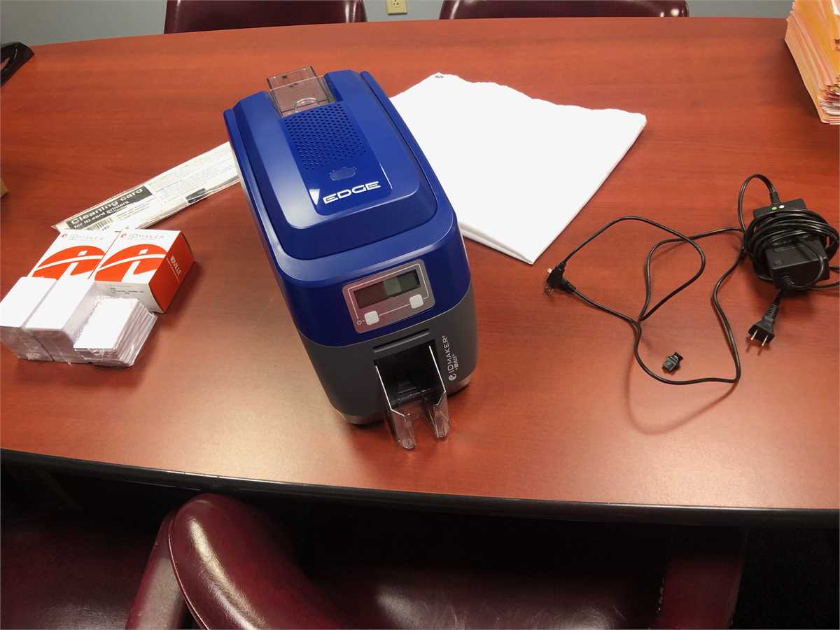 LOT OF ONE (1) ID Maker Edge System 2 (item# 10048) -sided printer, cleaning kit, white backdrop, YMCKO ribbon, and estimated 250 PVC cards. Cost new was $3,160.