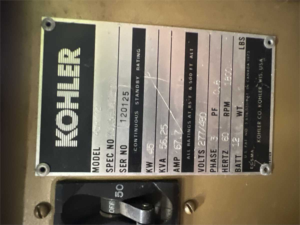 1978? Kohler Propane Generator. White 6 cylinder propane engine. 45000 kw. 825 hours. Ran well when taken out of service 8-10 years ago. Always under cover. Small oil leak coming from a from seal on the power head. No transfer switch included. Call with questions. 860-379-8306
