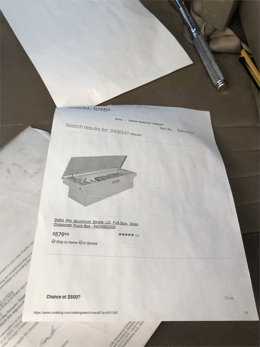 Here is a full size truck tool box delta pro model #PAC1582000. Dimensions 71x21x17.25" and should fit most full size trucks. In good shape but the seal is coming off and may need a new one. This came out of a ford f150 that is being taken out of service. Brand new this is $579. No keys but keys can be purchased online or at a locksmith. Thanks for looking and please check our other tool box and vehicle auctions.