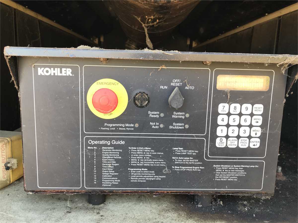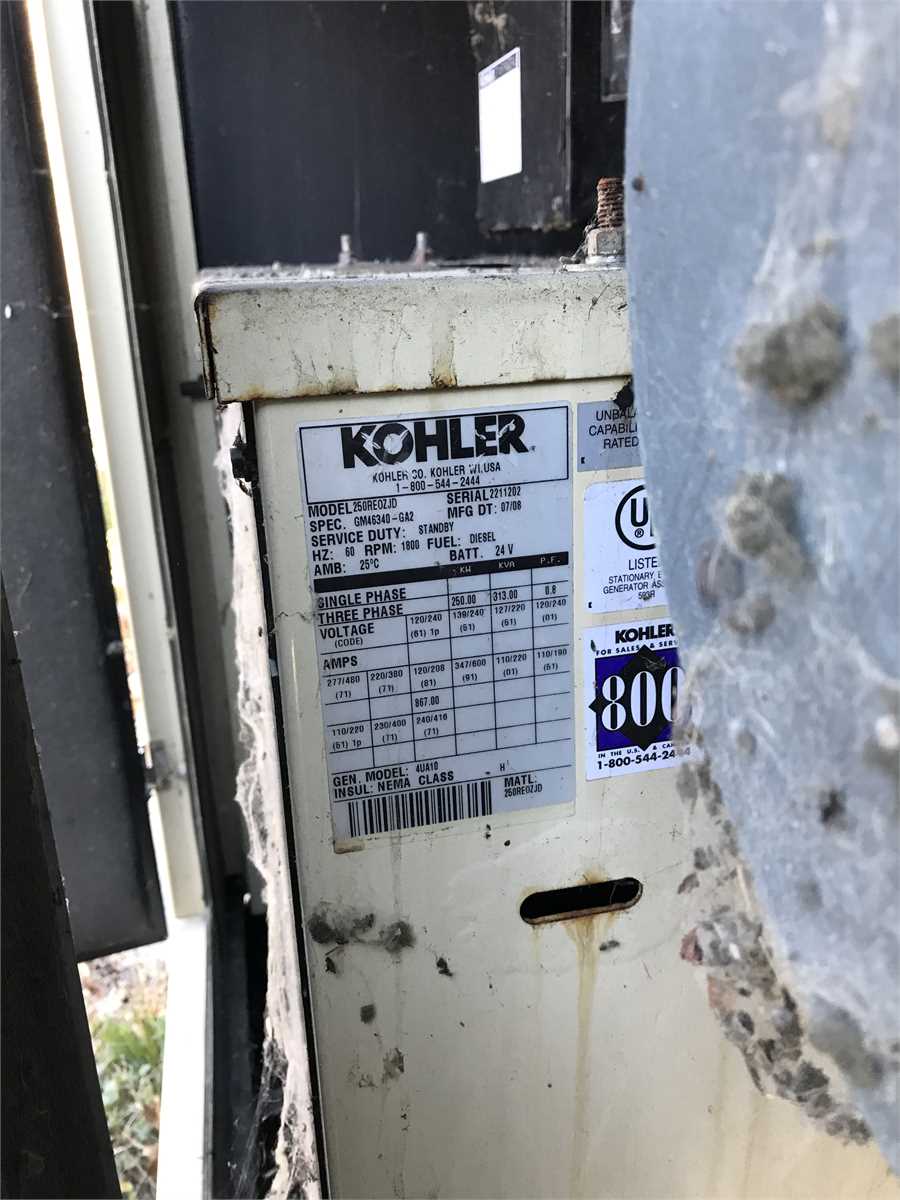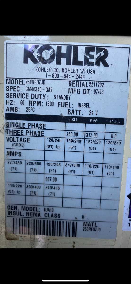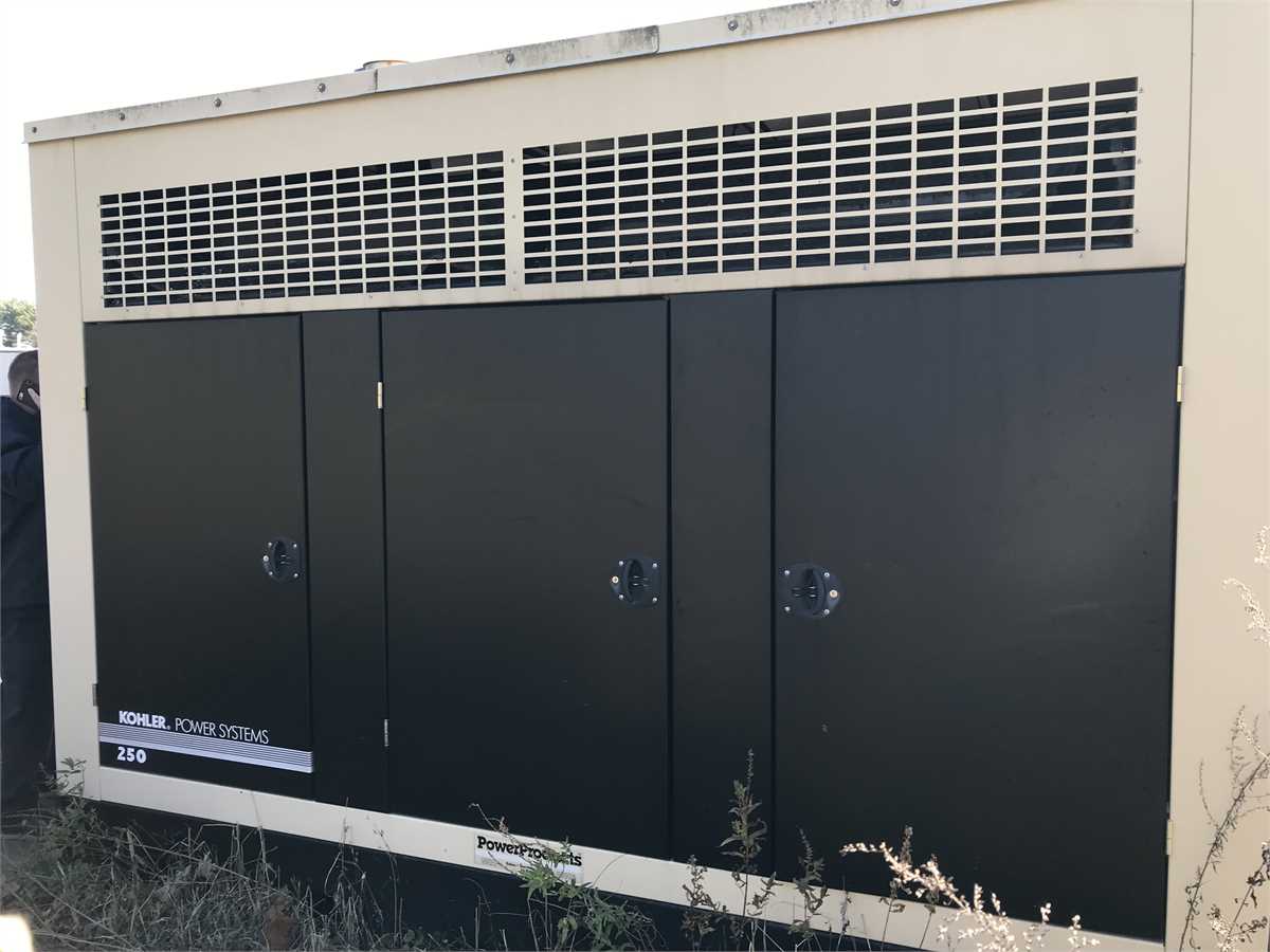 Kohler 250 generator powered by diesel. Has a 9.0 Liter John Deere engine. Being sold with Diesel Tank. Unknown if currently working. Was in working condition when removed from facility around 2016. The Town will assist with loading generators for removal.