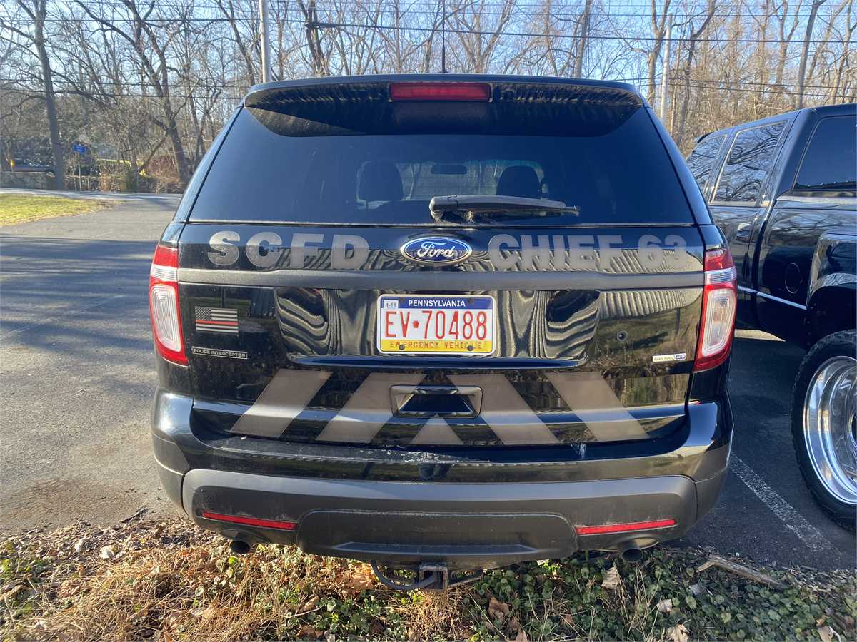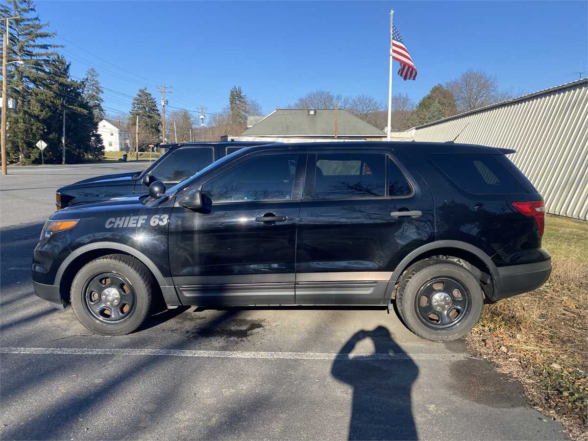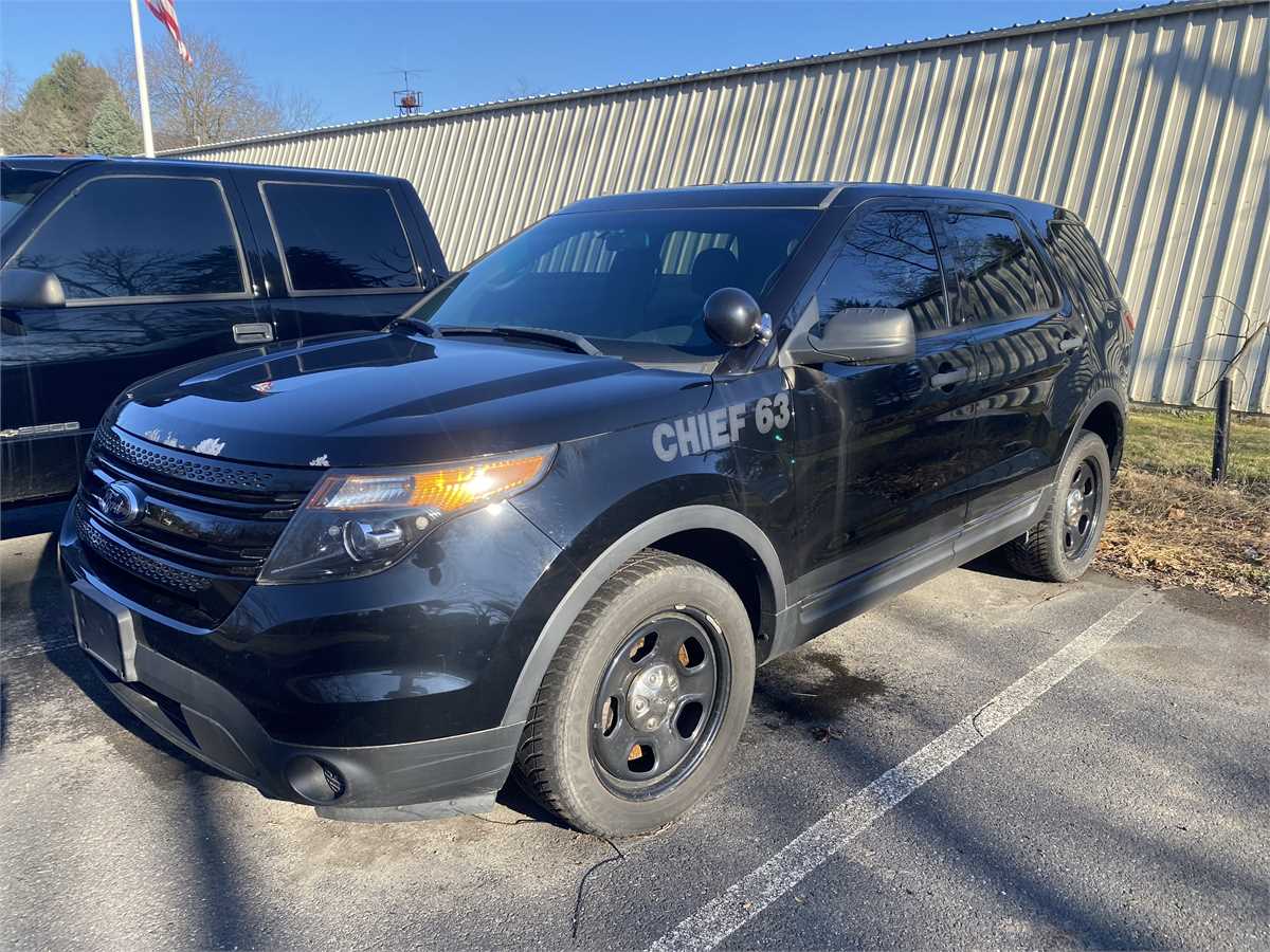 2013 Ford Explorer SUV - Police Interceptor. Used as an FD Chiefs vehicle. The motor runs well for 61,481 miles. Transmission shifts hard into reverse. Has a battery drain from the warning light system. Lights and Radios removed. The body is in good shape.