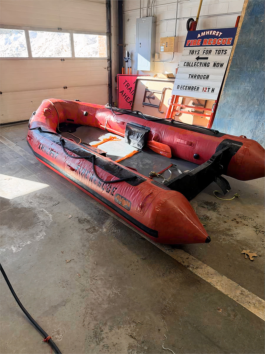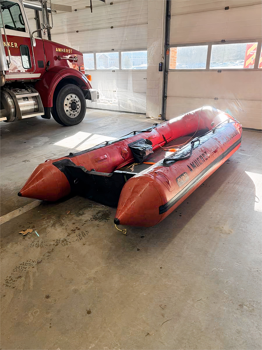 1997 Avon Inflatables FRB380 rescue boat previously operated by Amherst Fire & EMS in Amherst, New Hampshire. The vessel was used in municipal service from 1997 through 2023 before being retired as part of equipment replacement.